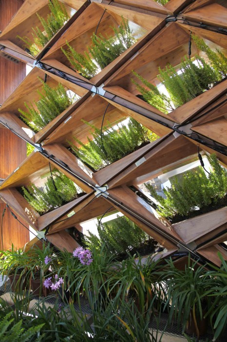1. Espacio Semi-abierto / Este espacio está rodeado principalmente por la piel de madera, que une a la energía solar, la ventilación y los componentes de sombreado vertical, con vegetación en los marcos con forma de rombo. Los componentes incluyen paneles solares fotovoltaicos y sistemas de sombreado. La elevación al oeste de la casa combina células solares de película delgada y muros verdes. El tamaño de los agujeros varía de acuerdo a la presión del viento, enriqueciendo el espacio semi-abierto y creando una “eco-transición” entre la naturaleza y el interior. El sistema de agua de los humedales bajo la cubierta expuesta juega un papel importante en la mejora de la calidad ambiental, mientras que el sistema de niebla de pulverización crea un ambiente confortable y agradable para diversos eventos, así como para enfriar el viento que sopla a través de la sala de estar.
